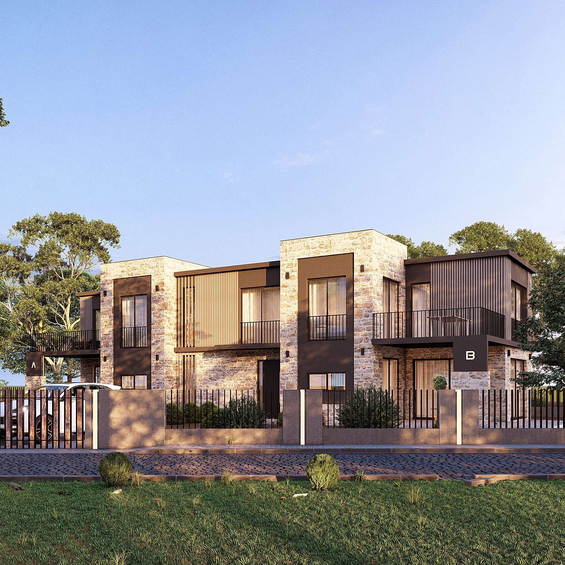 Taş cephenin yanı sıra ahşap kaplamaların eklenmesi, estetik paleti daha da zenginleştirdi. Ahşap elemanlarda gri tonların tercih edilmesi, tek düzelik hissini kırmakla kalmayıp görsel bir dinamizm de katıyor.